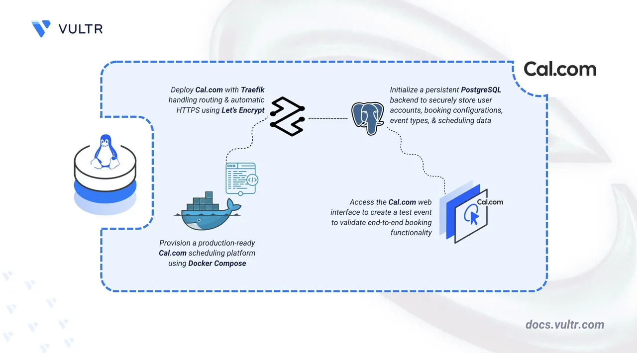 This article explains how to deploy Cal.com using Docker Compose with PostgreSQL for persistent data storage and Traefik as a reverse proxy. It covers Hypertext Transfer Protocol Secure (HTTPS) configuration with automatic certificate provisioning through Let's Encrypt using a custom domain.