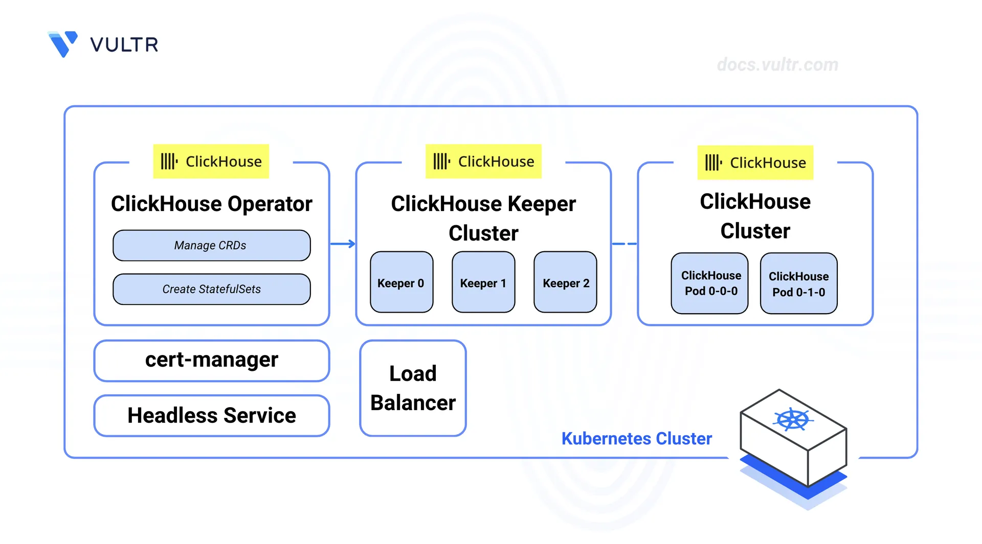The ClickHouse Operator manages the creation, updates, and removal of ClickHouse and Keeper clusters. It needs cert-manager to issue TLS certificates for its webhooks before the operator can start.