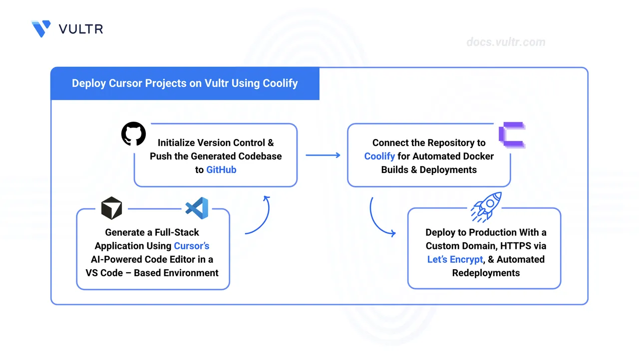 This guide explains how to set up Cursor, generate a full-stack application with AI assistance, push the code to GitHub, and deploy it on Vultr using Coolify.