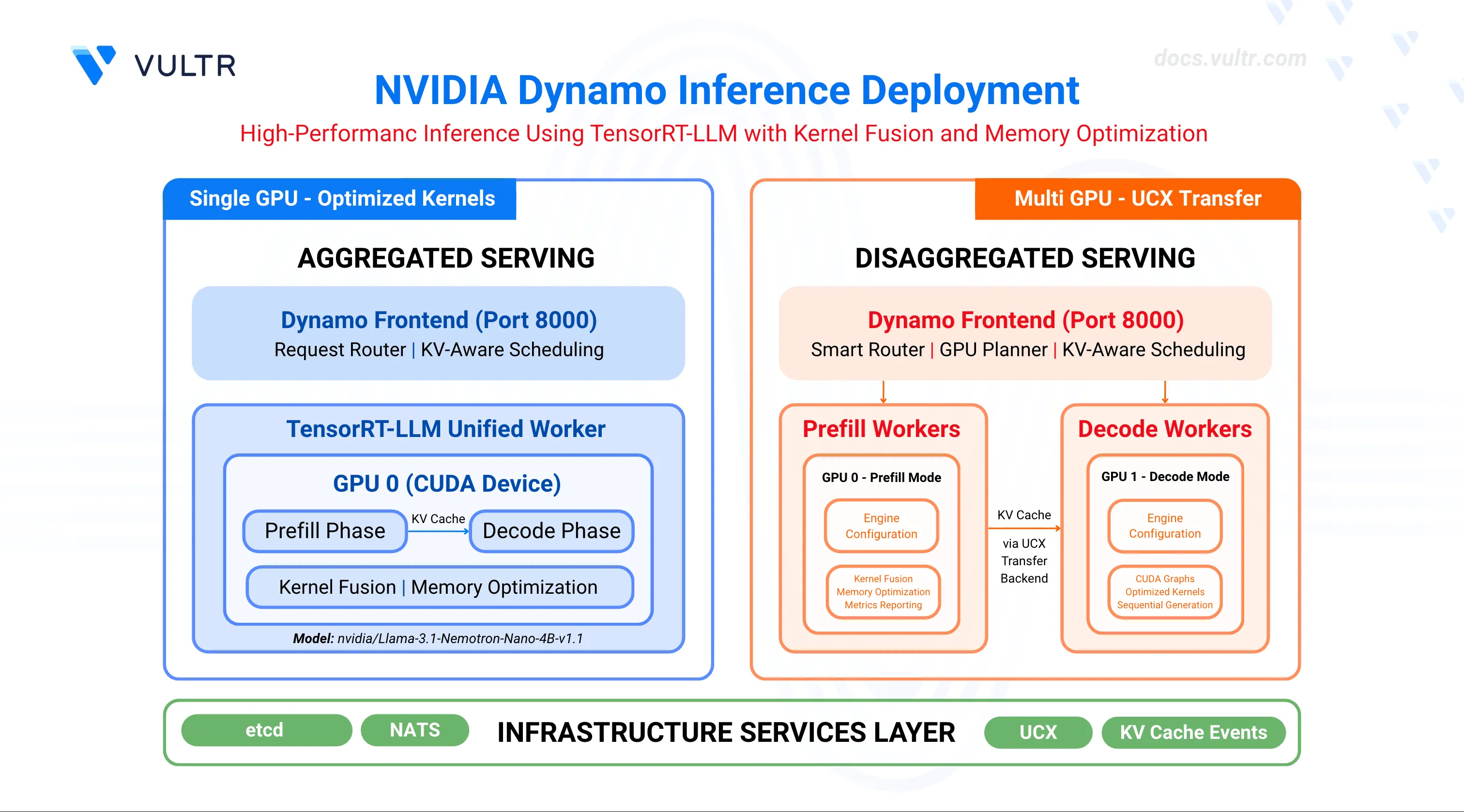 This guide outlines the deployment of NVIDIA Dynamo with TensorRT-LLM, an optimized inference engine that delivers exceptional performance through kernel fusion and memory optimization. It covers infrastructure configuration, container deployment, aggregated serving for unified workloads, and disaggregated serving that distributes prefill and decode operations across separate GPU workers.