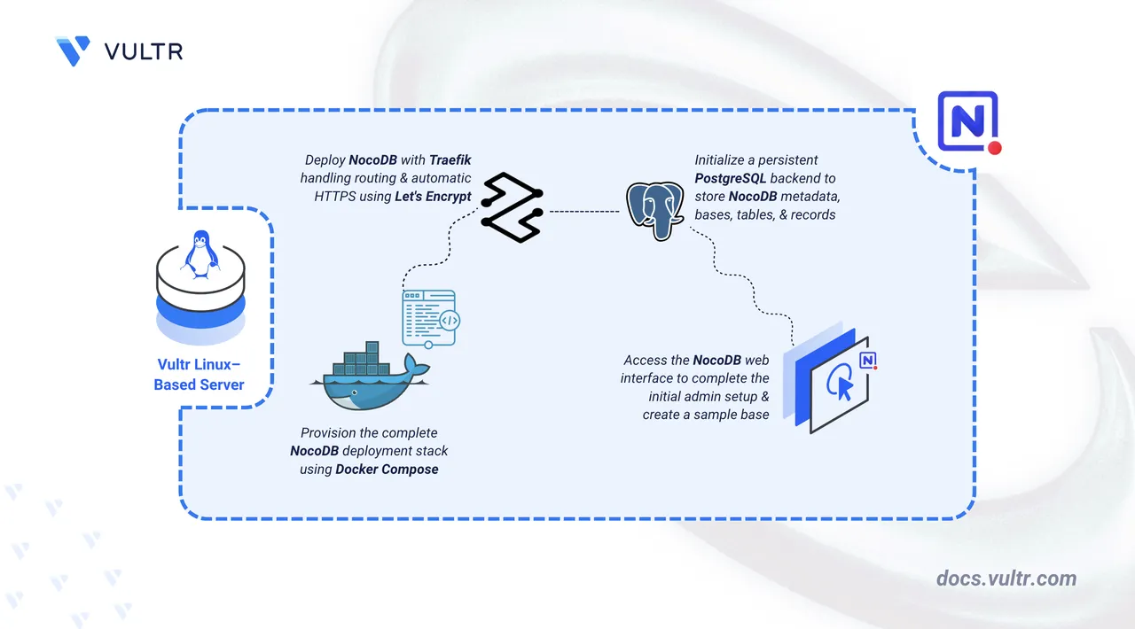 This article explains how to deploy NocoDB on a Linux server using Docker Compose, configure persistent storage with PostgreSQL, secure the application with HTTPS using Traefik, and verify functionality by creating a sample base.