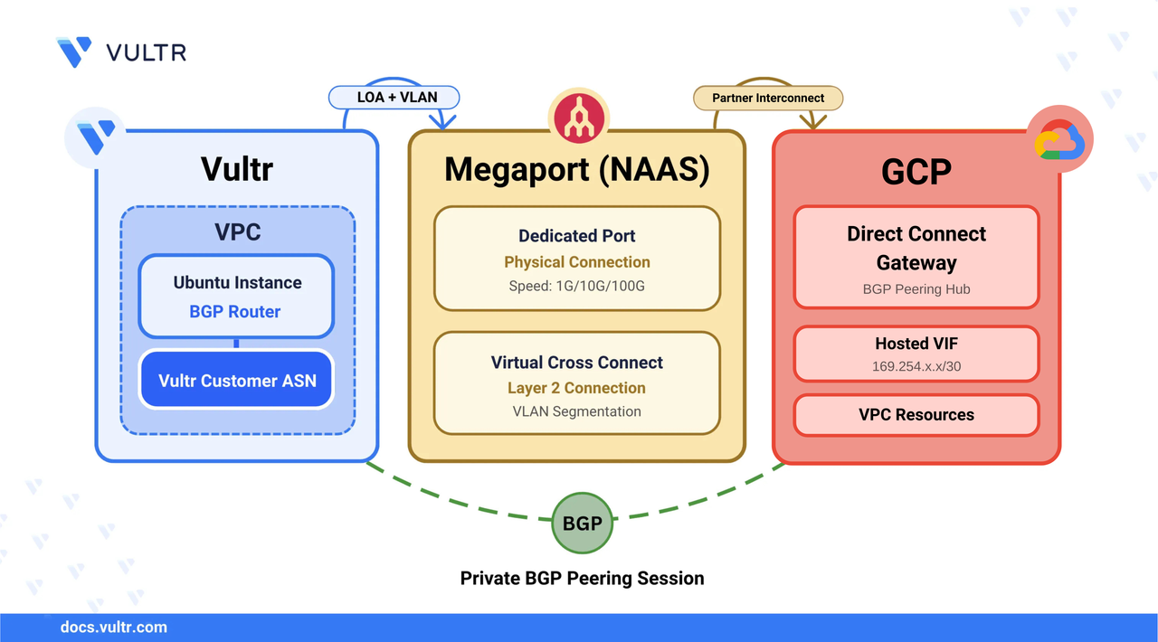 In this guide, you will create a private, low-latency connection between Vultr and GCP using Direct Connect hosted through Megaport. You will provision a dedicated port, order a Virtual Cross Connect (VXC) using Megaport, configure the connection on both Vultr and GCP, and verify the setup by testing BGP route advertisements and end-to-end connectivity between your Vultr and GCP resources.