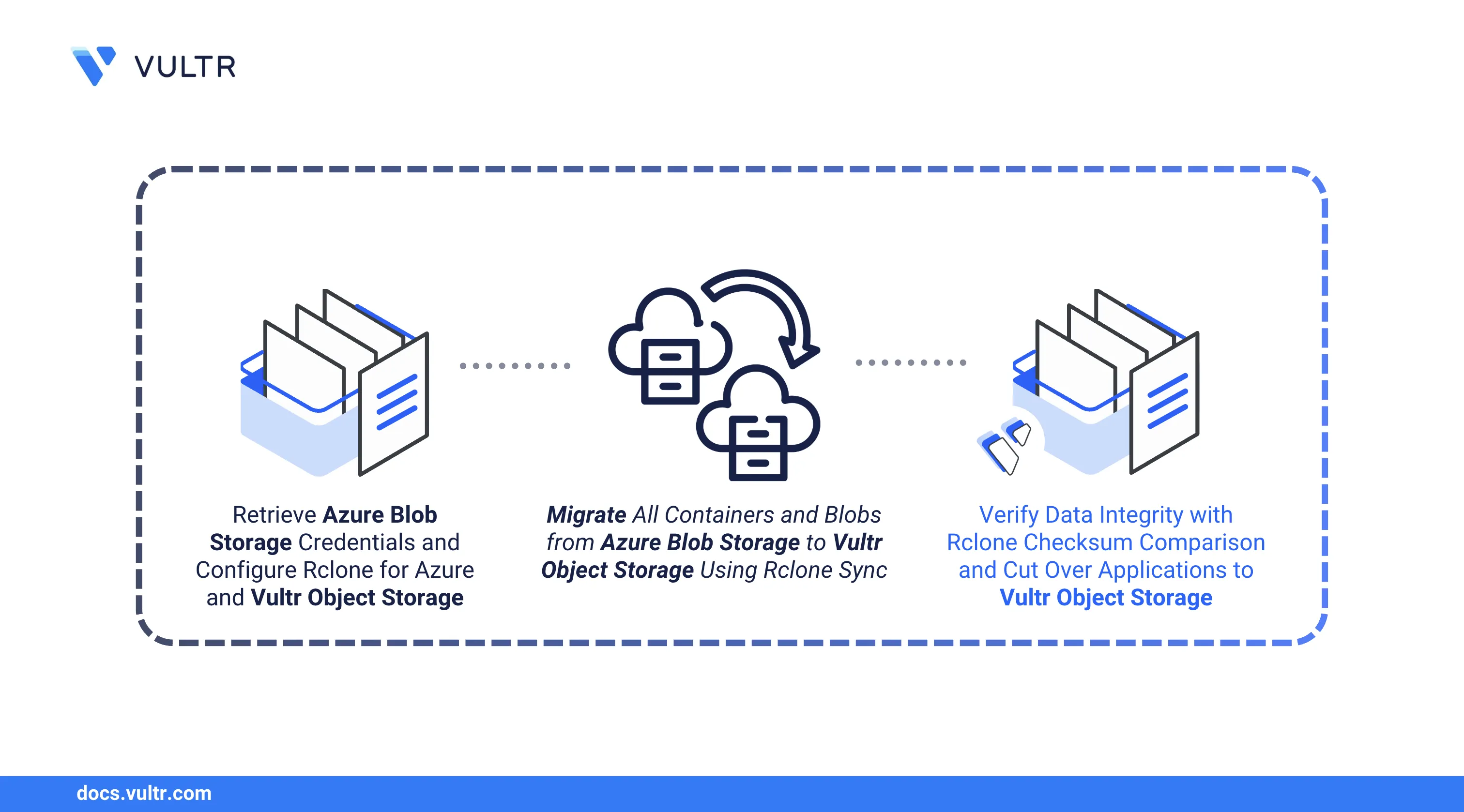 This guide explains how to migrate your containers and blobs from Azure Blob Storage to Vultr Object Storage using Rclone. You will configure authentication for both storage providers, transfer your data, verify integrity, and complete the cutover.