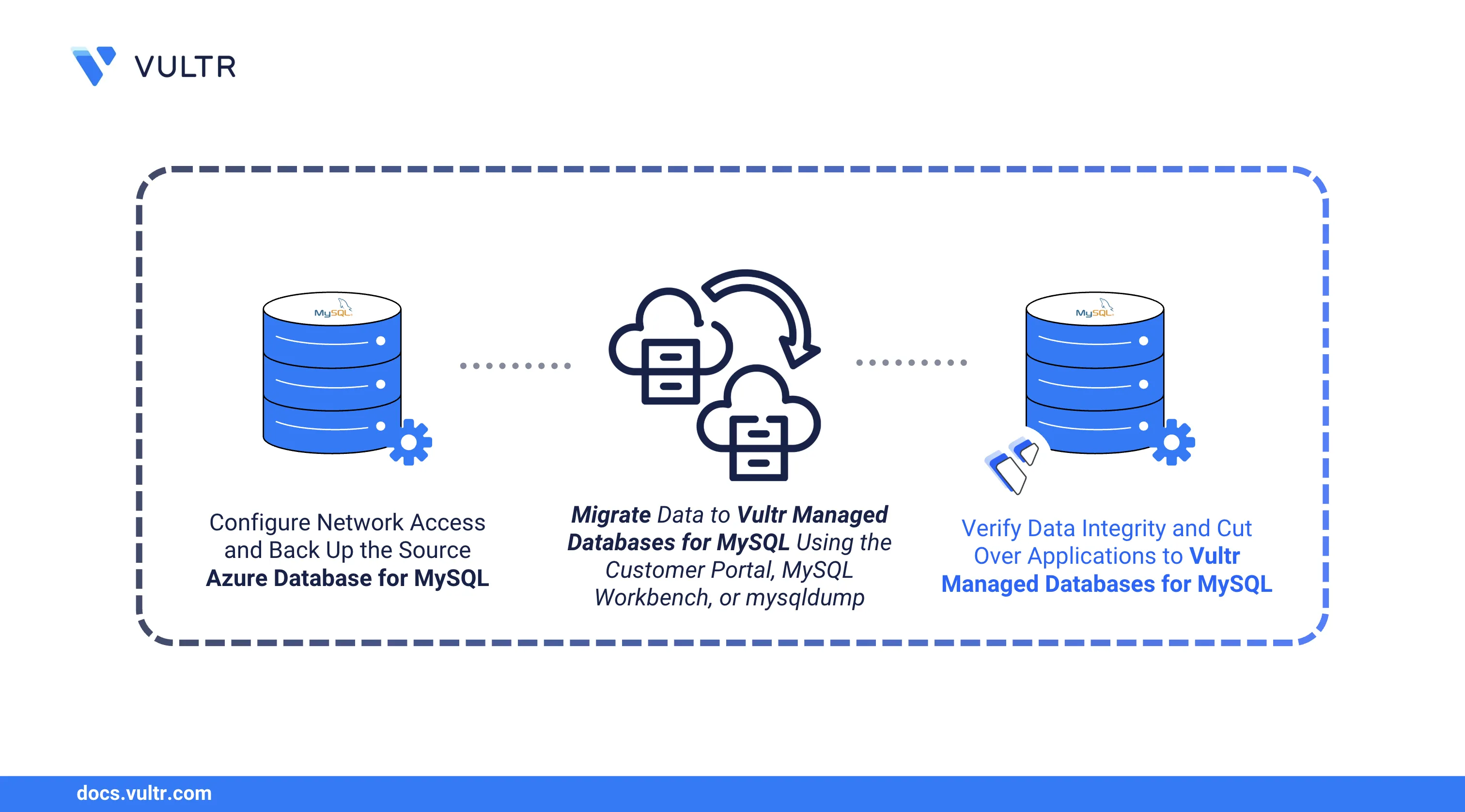 This guide explains how to migrate your Azure Database for MySQL to Vultr Managed Databases for MySQL with minimal downtime. You will configure network access, back up your source database, transfer your data, and verify the migration before cutting over applications.