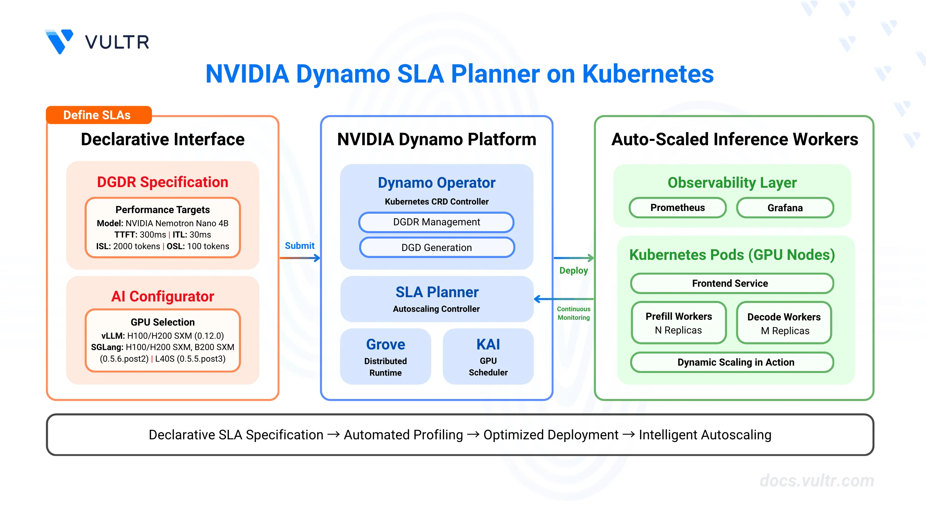 This guide covers the deployment of Dynamo's SLA Planner on Kubernetes, including infrastructure setup with Prometheus monitoring, DynamoGraphDeploymentRequest (DGDR) configuration for automated profiling and deployment, and Grafana dashboard integration for visualizing scaling decisions and performance metrics.